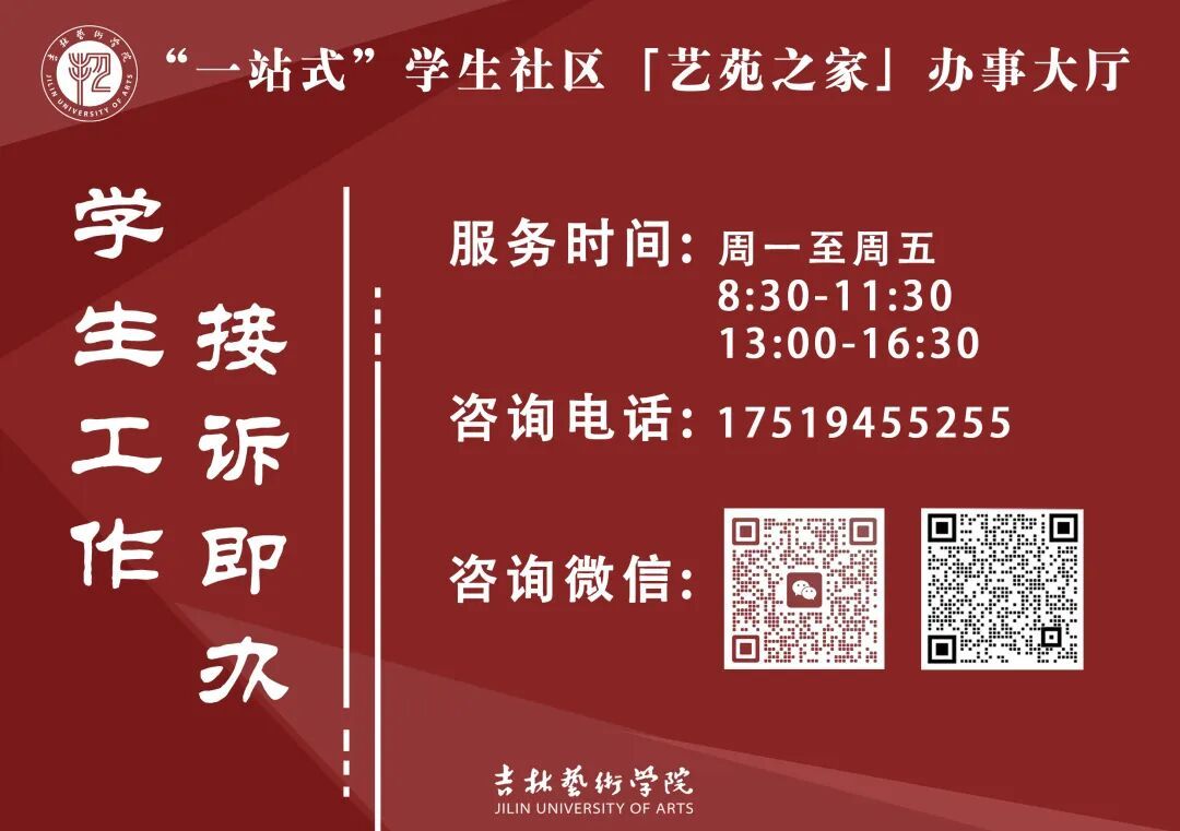亲爱的同学们: 新学期,新起点,新气象,新征程!金秋九月,同学们相聚校园,即将开始本学期的学习生活。为了方便大家咨询关注的事项、帮助大家解决遇到的问题困难,本学期“接诉即办”服务持续开通。 学生工作部(处)将持续秉承让同学们办事“少跑一趟路、少进一扇门、少找一个人”的原则,通过吉艺〈一站式〉学生社区_接诉即办线上咨询平台,切实帮助师生解决急难愁盼问题,同学们如有需要,可通过微信扫码或拨打热线电话的方式咨询反馈相关问题。 学生工作处 2025年9月12日