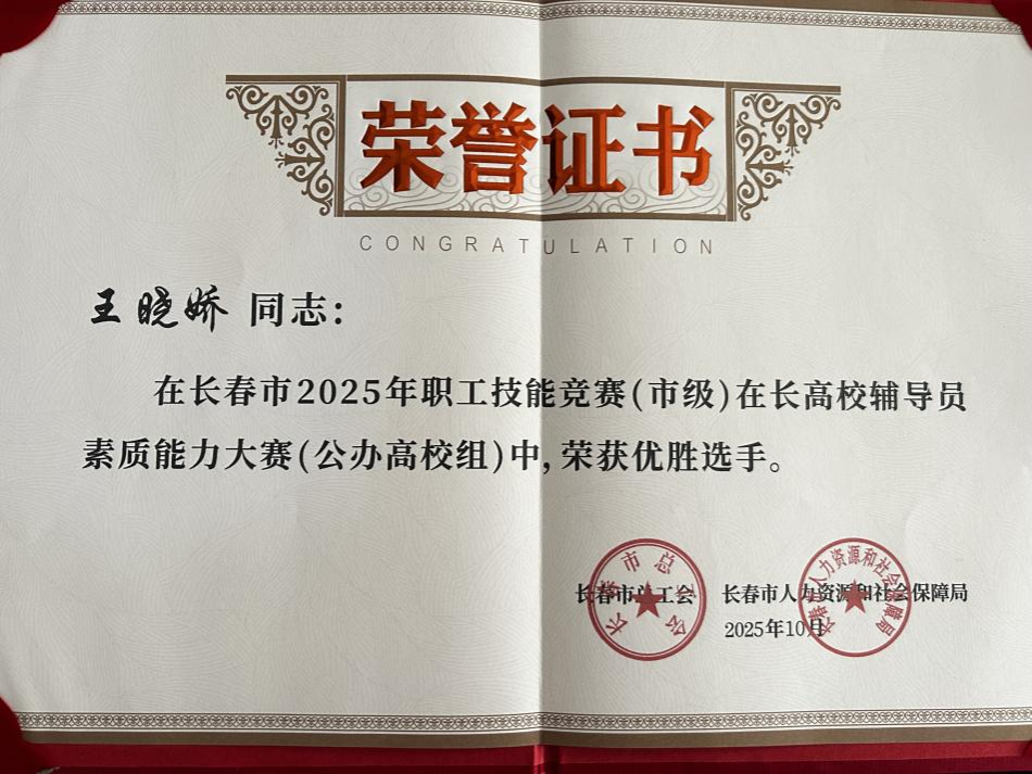 10月26日,由长春市总工会、长春市人力资源和社会保障局联合举办的“2025年在长高校辅导员素质能力大赛”决赛在长春工业大学落下帷幕。我院设计学院辅导员王晓娇凭借扎实的理论素养和出色的实践能力,在比赛中荣获优胜奖,充分展现了我院辅导员队伍的良好精神风貌和育人工作成效。