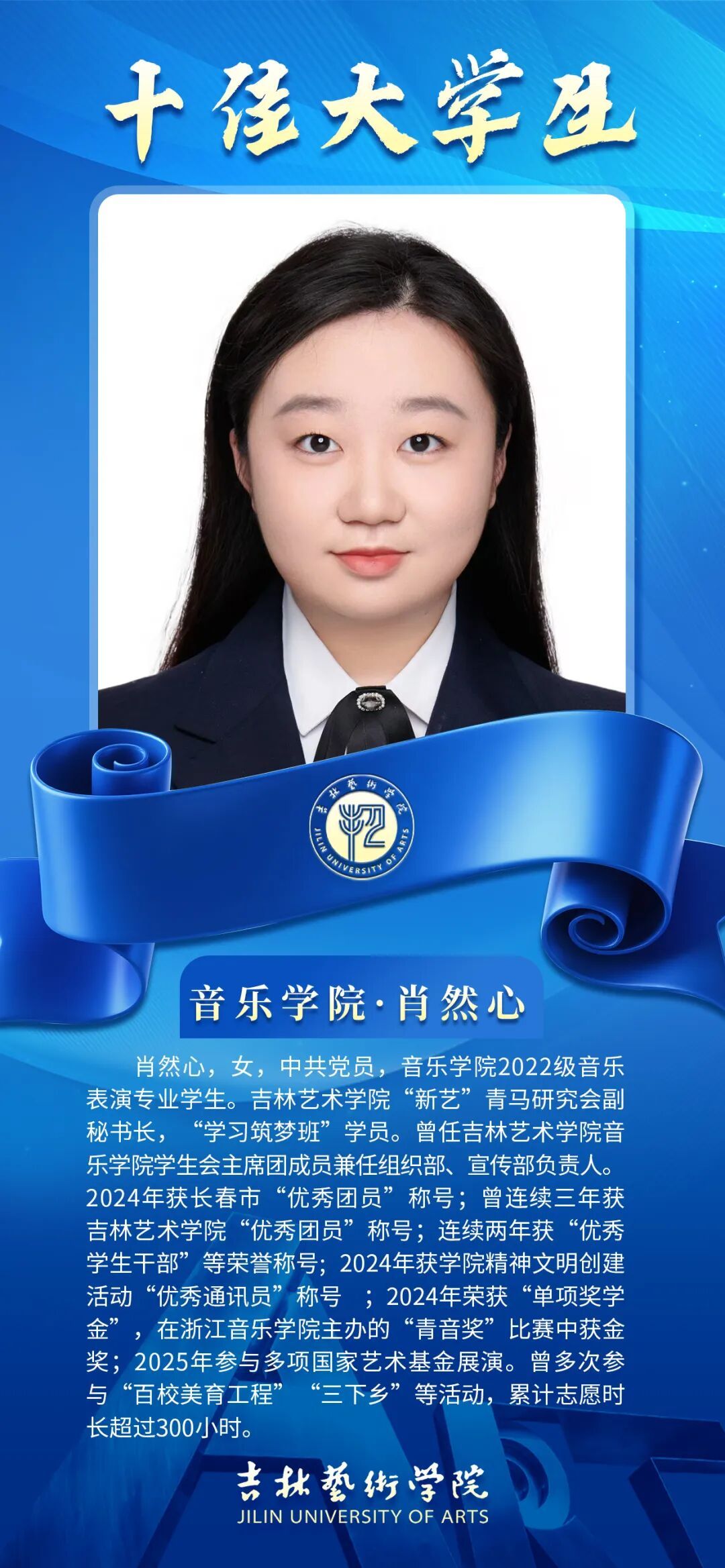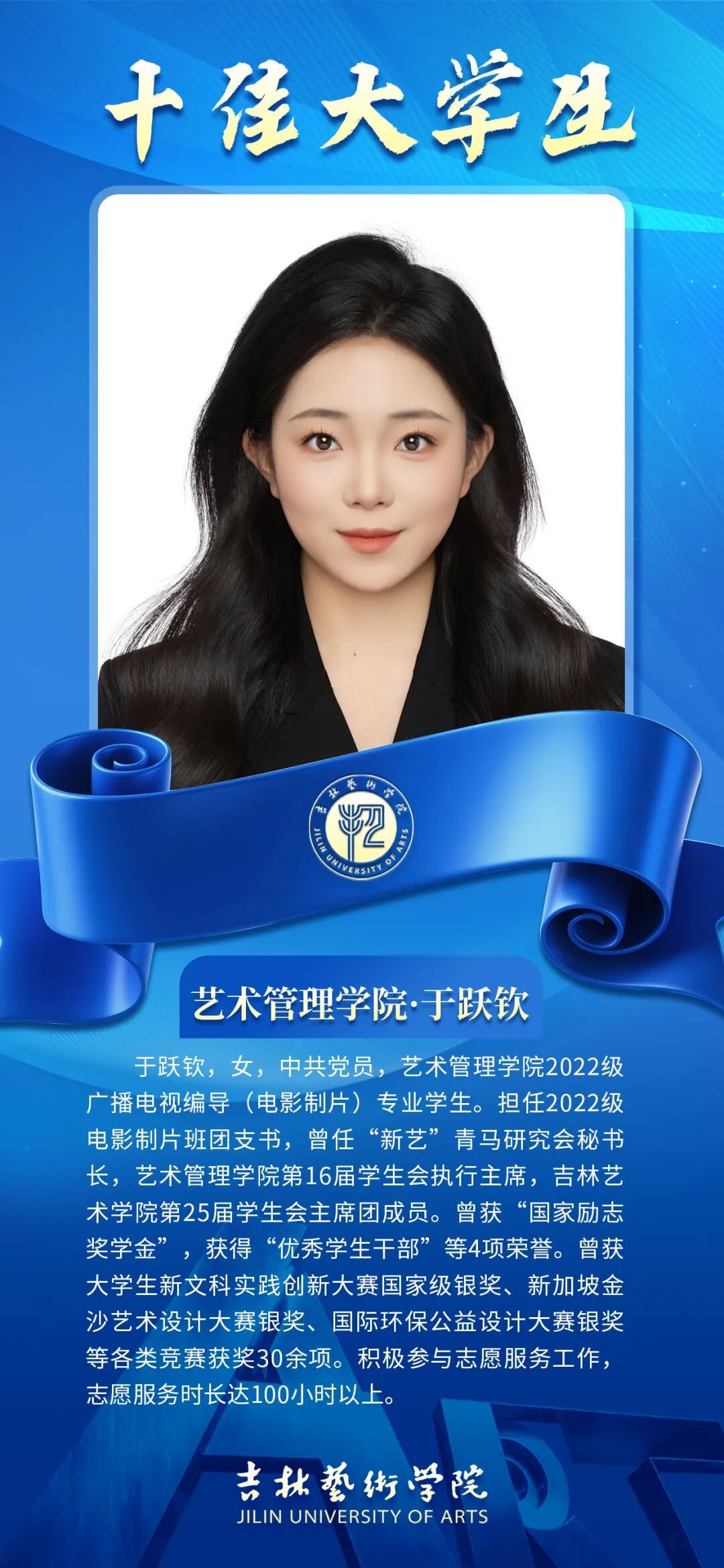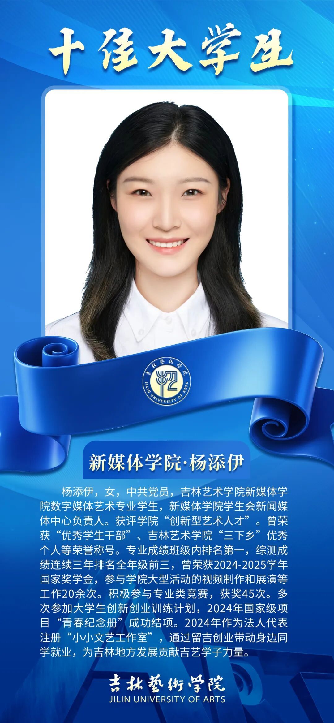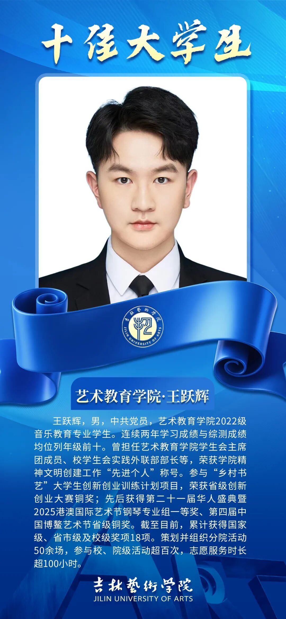 怀揣艺术梦想,肩负青年担当。在吉艺这片沃土上,他们以青春之名,挺立潮头,勇担时代重任;以艺术之志,挥洒激情,书写着无愧于青春的奋斗篇章。他们就是吉林艺术学院2024—2025学年“十佳大学生”获得者。 学生工作处 2025年12月17日