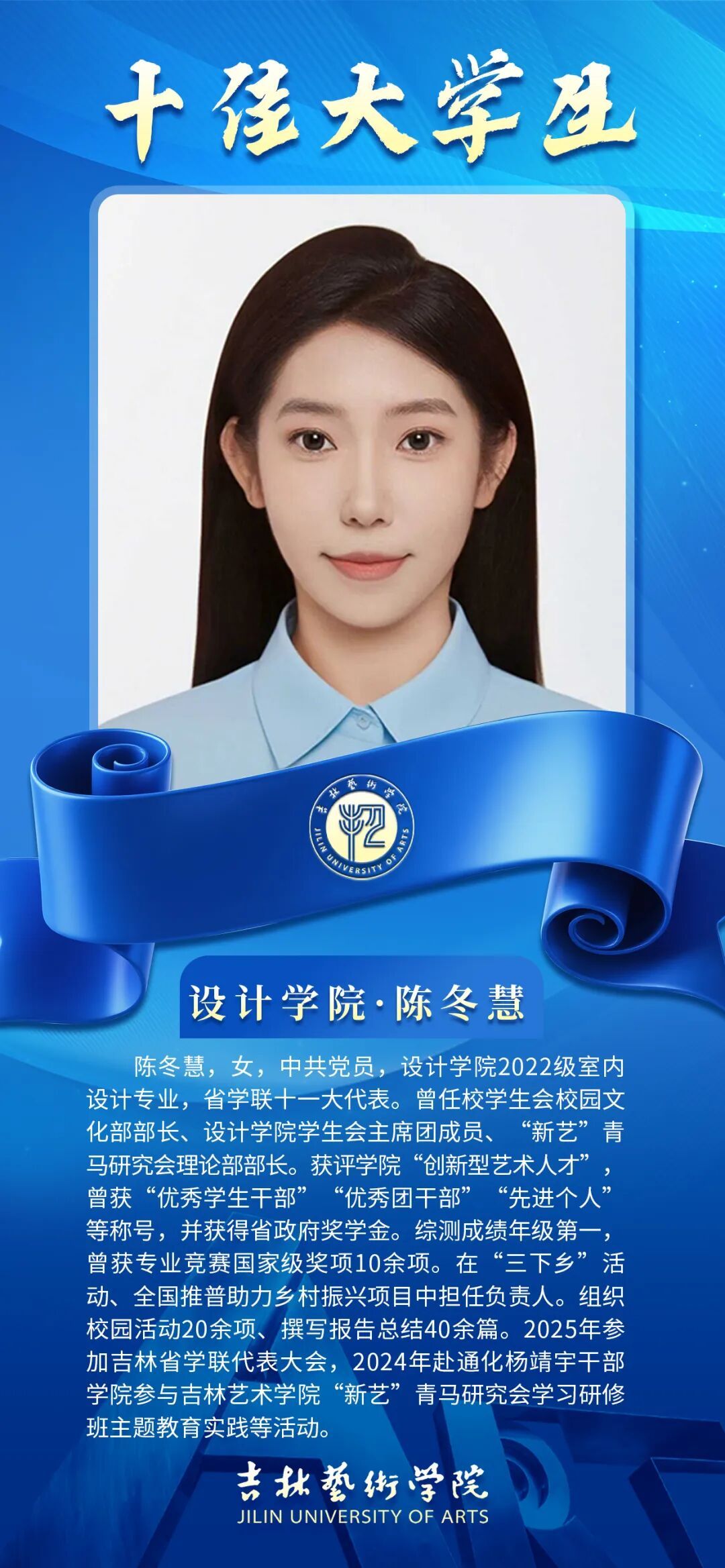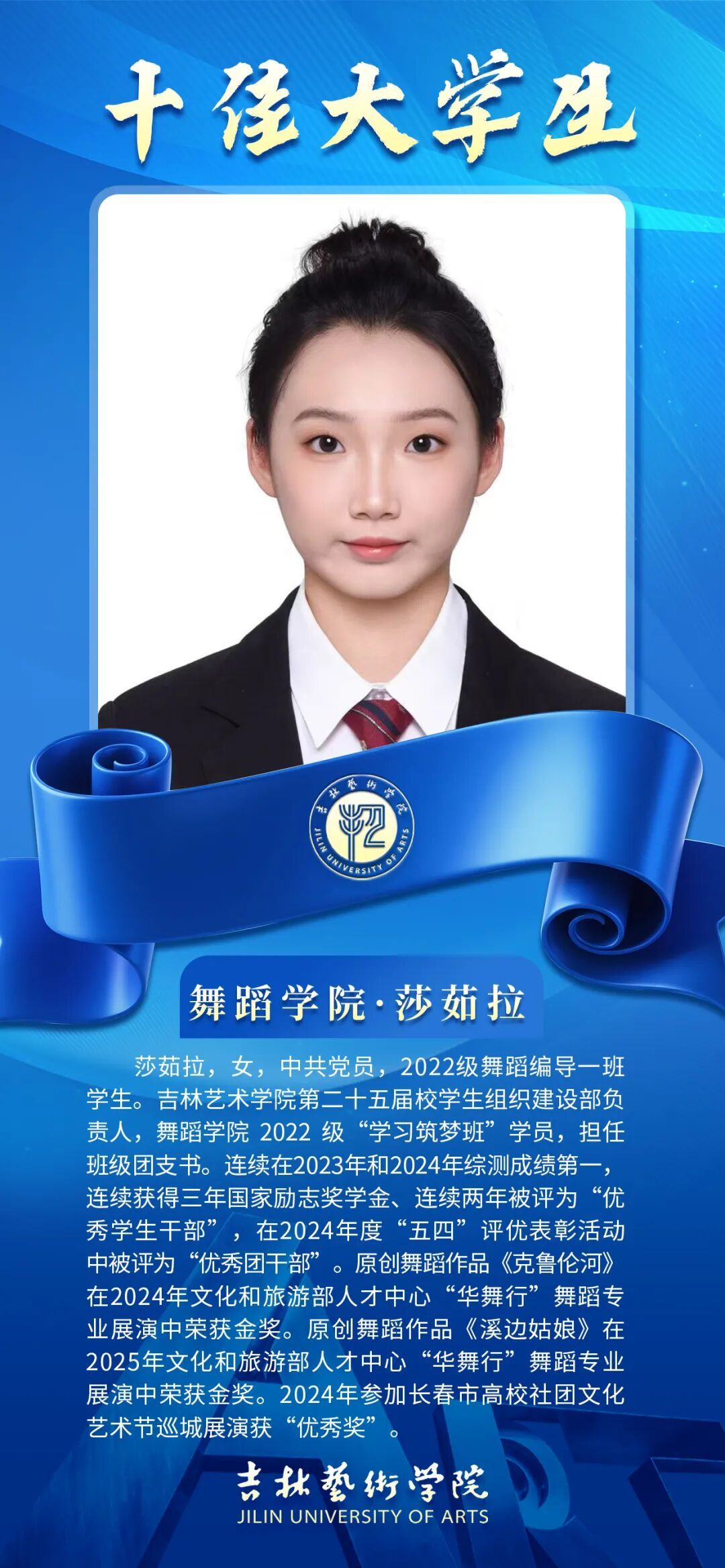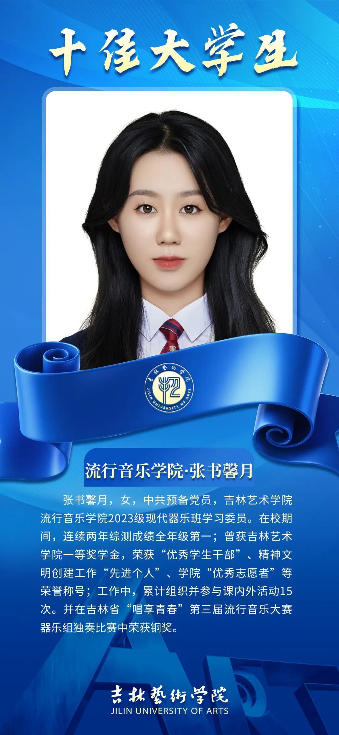 怀揣艺术梦想,肩负青年担当。在吉艺这片沃土上,他们以青春之名,挺立潮头,勇担时代重任;以艺术之志,挥洒激情,书写着无愧于青春的奋斗篇章。他们就是吉林艺术学院2024—2025学年“十佳大学生”获得者。 学生工作处 2025年12月17日